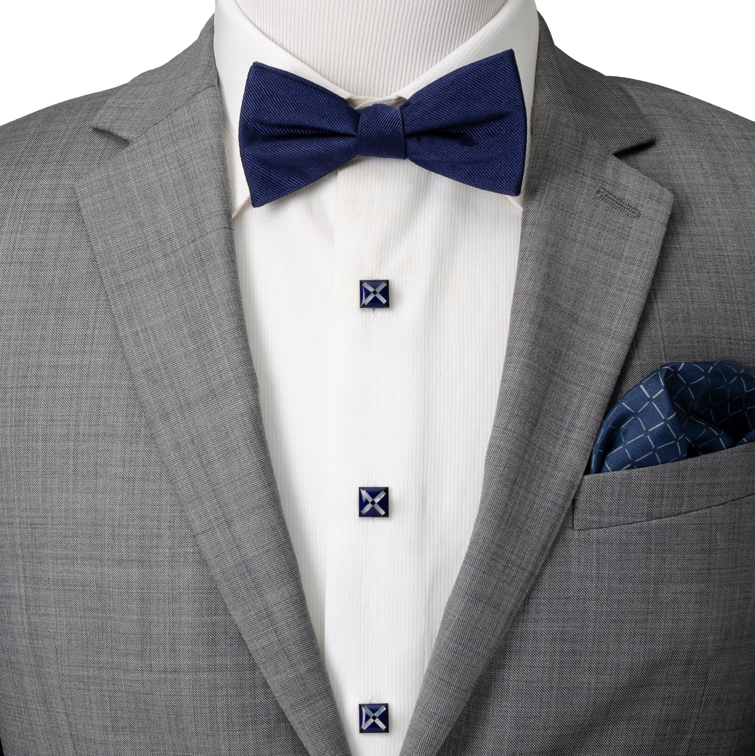 Dress to impress with our simple yet lavish Mother of Pearl Diamond Studs. The face of the studs are made with Mother of Pearl, Onyx, and blue stone set in an intricate diamond argyle pattern. The expert craftsmanship of our base metal studs ensures long-lasting durability. Pairs perfectly with our Mother of Pearl Diamond Cufflinks.